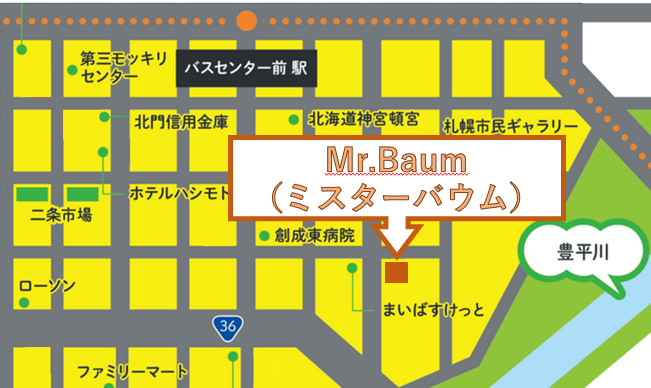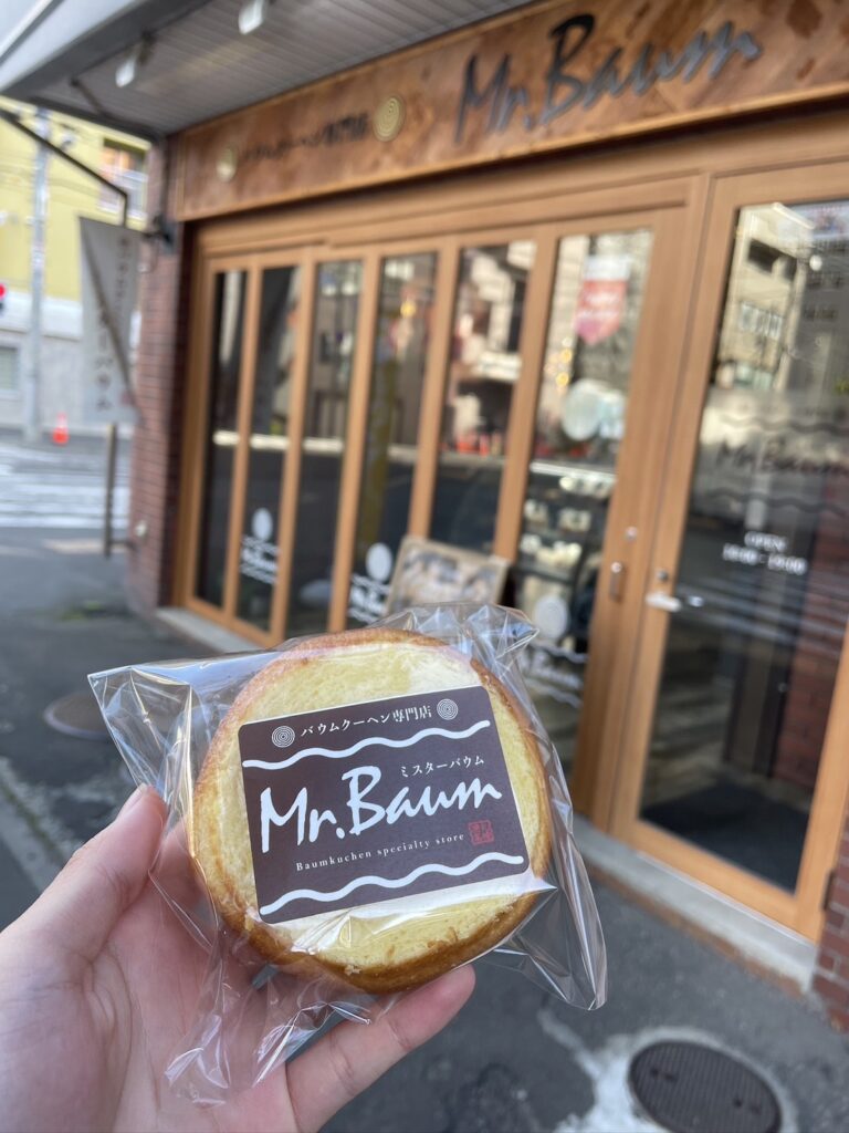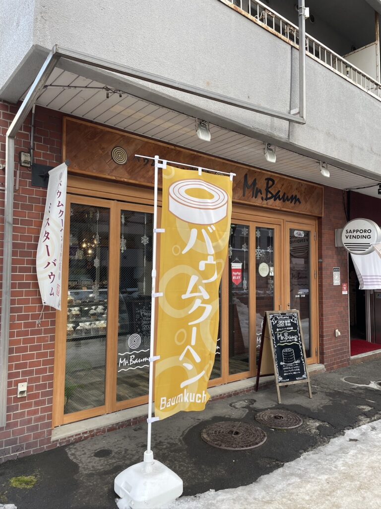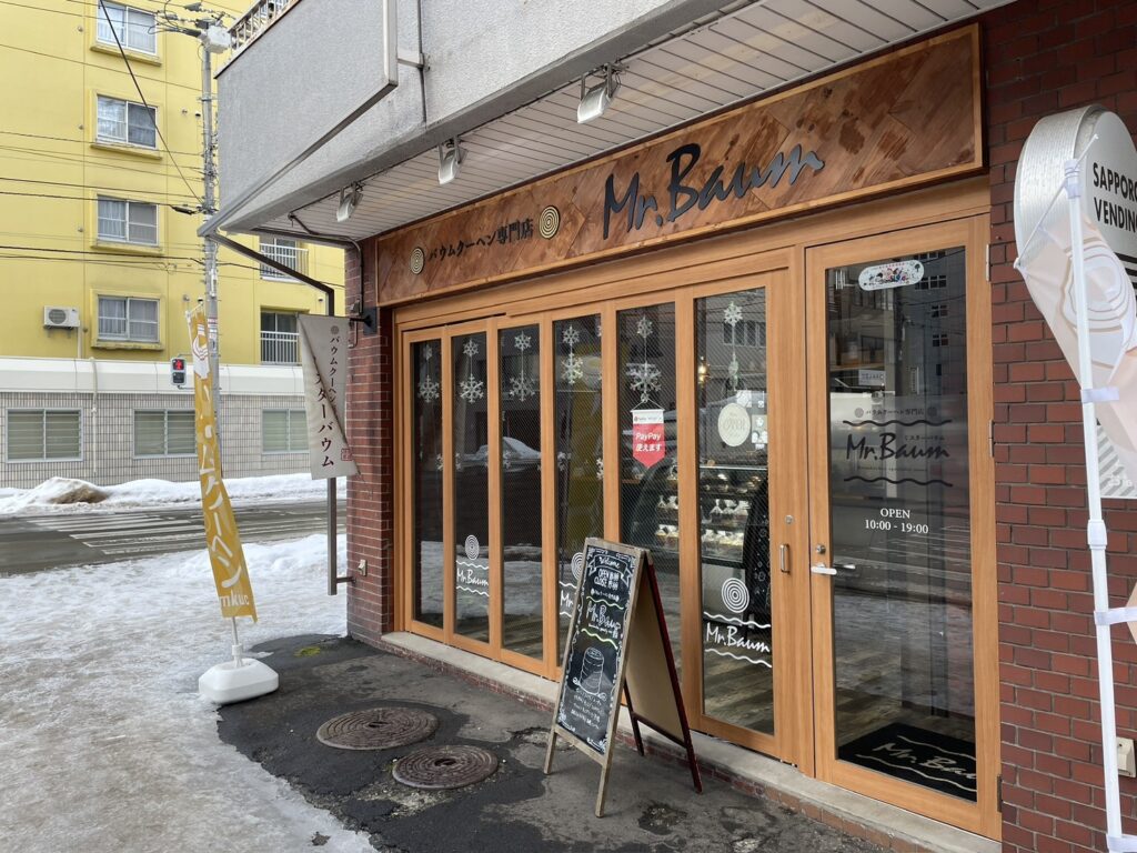 すすきのから創成イースト地区の方へまっすぐ進んでい くと見えてく木とレンガによって温かな外観のバウムク 一ヘン屋さんMr. Baum。